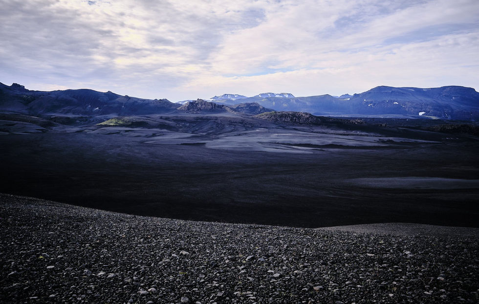 כשיצאתי מהקניון, התגלה אל מול עיניי עוד עמק שחור, ארוך יותר מקודמו. בהמשך הלכתי בעוד ועוד עמקים שחורים – כל אחד מהם מרהיב יותר מהקודם. בדיעבד, כשמסתכלים על מפת הלווין של האיזור, מבינים שמדובר בתא שטח עצום, שהתכסה כולו בנשורת של התפרצויות מרובות של הרי הגעש באיזור. עליתי מהעמק השחור, ופתאום התחלתי לראות קצת ירוק. כמו שהעמקים השחורים הופיעו באופן פתאומי, ככה הם גם נעלמו. במקומם הופיעה צמחיה ירוקה צמודה לקרקע. לאט לאט הופיעו גם פרחים וסלעים עצומים המכוסים בטחב. השביל המשיך דרך שדה גדול של אבנים, ועליהם טחב עד שהגעתי לנהר ה-Helliskvisl - חציית הנהר הראשונה במסלול. מצאתי את הנקודה הכי רחבה (וכתוצאה מכך הכי רדודה) והתחלתי לחצות. הזרם היה קר ויחסית מהיר. להקלתי הרבה, המים הגיעו קצת מעל לברך. חציתי את הנהר בהצלחה, ועליתי על הגדה השנייה.