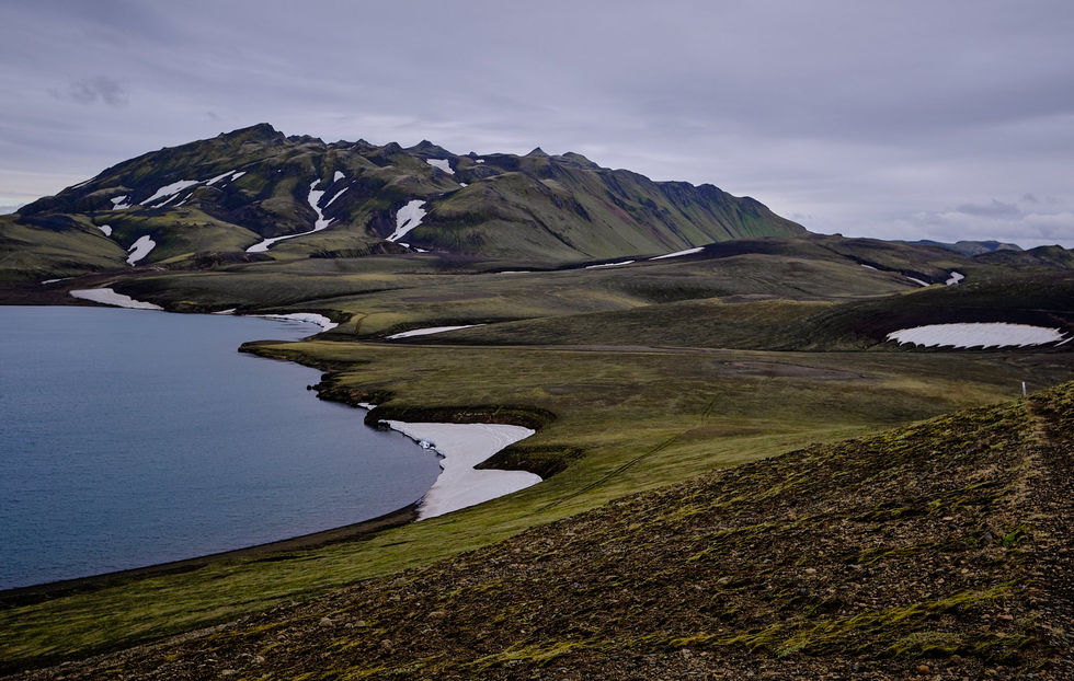 בהמשך הגעתי לעמק שחור אחרון לחלק זה. נראה היה שהוא כבר לא כל כך שחור – היו גם לא מעט חלקים ירוקים. נראה שהחיים עמדו לנצח בעמק זה. באמצע זרם נחל קטן, אל תוך אגם Hrafnabjargavatn, אשר נמצא בגובה 550 מטר מעל פני הים. זה היה האגם הראשון מני הרבים שאתקל בהם בימים הקרובים. לאחר עלייה ארוכה ומעייפת דרך חול וולקני שחור, סלעים חומים וקטעי שלג קצרים, והליכה של עוד כ-4 קילומטרים, הגעתי לאגם נוסף, Herbjarnarfellsvatn. גובהו הוא 625 מטרים, והשביל עובר כמה עשרות מטרים מעליו. גדות הנהר היו עדיין מכוסות במקומות מסוימים בשלג, וכל כך שמחתי שהשביל איפשר תצפית כה נהדרת על אגם מרהיב זה. האגם נמצא במרחק של כ-2.5 קילומטרים ממחנה סיור היום ב-Landmannavellir. ניתן לראות את המחנה מרחוק. למעשה, ישנם שני מקומות באיזור – הראשון הוא חוות סוסים, וכחצי קילומטר לאחר מכן, מגיעים למחנה עצמו.